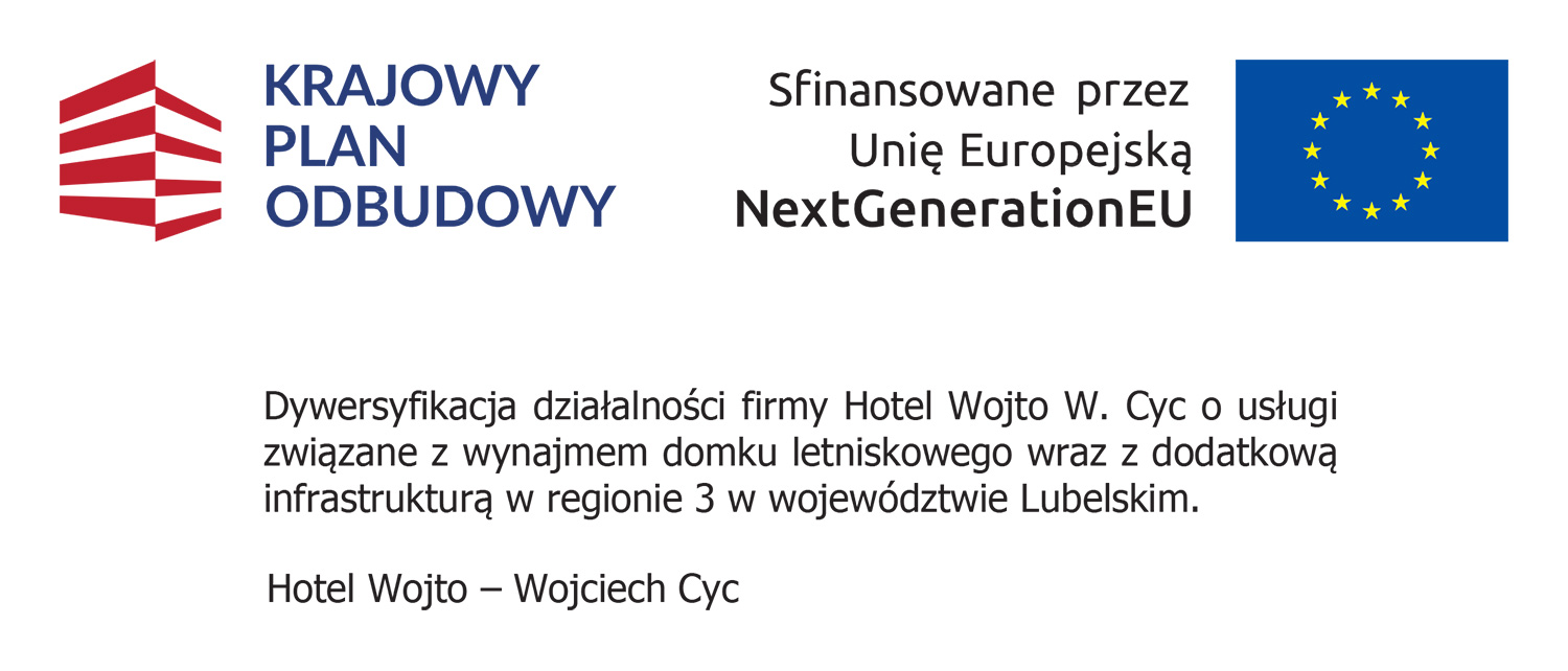Hotel Wojto Wojciech Cyc realizuje przedsięwzięcie MŚP pod nazwą: „Dywersyfikacja działalności firmy Hotel Wojto Wojciech Cyc o usługi związane z wynajmem domku letniskowego wraz z dodatkową infrastrukturą w regionie 3 w województwie Lubelskim” finansowane ze środków Programu: Krajowy Plan Odbudowy i Zwiększania Odporności (KPO), Priorytet: Odporność i konkurencyjność gospodarki – część grantowa, Działanie: A1.2.1. Inwestycje dla przedsiębiorstw w produkty, usługi i kompetencje pracowników oraz kadry związane z dywersyfikacją działalności.